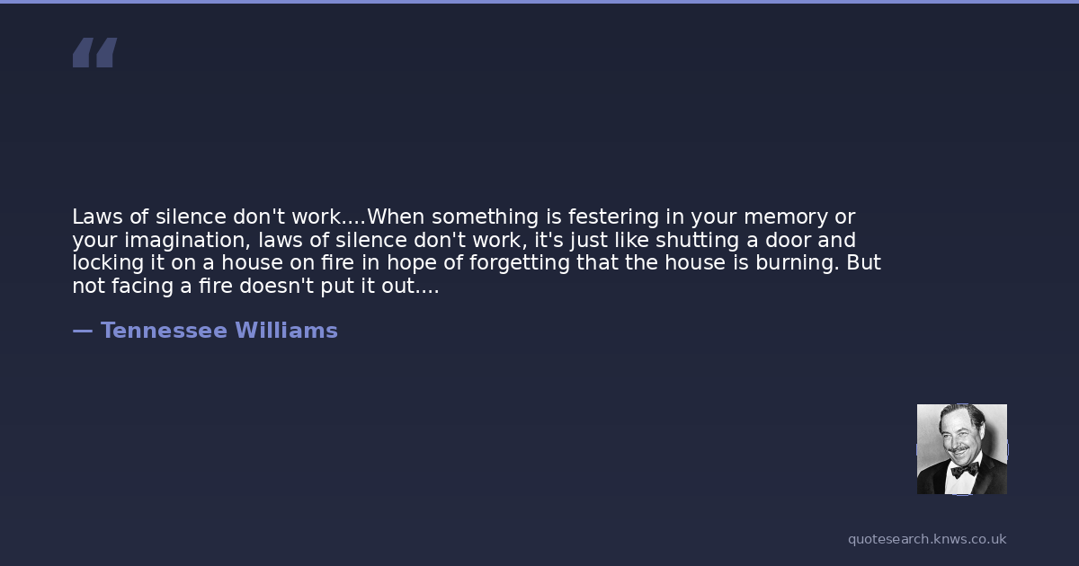 Laws of silence don't work....When something is festering in your memory or your imagination, laws of silence don't work, it's just like shutting a door and locking it on a house on fire in hope of forgetting that the house is burning. But not facing a fire doesn't put it out. Silence about a thing just magnifies it. It grows and festers in silence, becomes malignant....