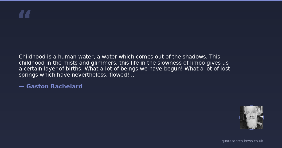 Childhood is a human water, a water which comes out of the shadows. This childhood in the mists and glimmers, this life in the slowness of limbo gives us a certain layer of births. What a lot of beings we have begun! What a lot of lost springs which have nevertheless, flowed! Reverie toward our past then, reverie looking for childhood seems to bring back lives which which have never taken place, lives which have been imagined. Reverie is a mnemonics of the imagination. In reverie we re-enter into contact with possibilities which destitute has not been able to make use of.