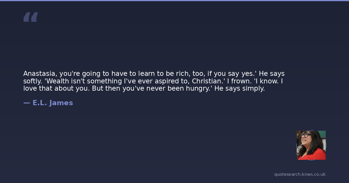 Anastasia, you're going to have to learn to be rich, too, if you say yes.' He says softly. 'Wealth isn't something I've ever aspired to, Christian.' I frown. 'I know. I love that about you. But then you've never been hungry.' He says simply.
