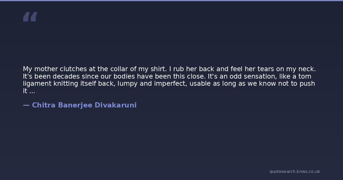 My mother clutches at the collar of my shirt. I rub her back and feel her tears on my neck. It's been decades since our bodies have been this close. It's an odd sensation, like a torn ligament knitting itself back, lumpy and imperfect, usable as long as we know not to push it too hard.