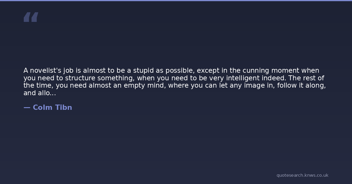 A novelist's job is almost to be a stupid as possible, except in the cunning moment when you need to structure something, when you need to be very intelligent indeed. The rest of the time, you need almost an empty mind, where you can let any image in, follow it along, and allow an emotional charge, almost the way actors and singers can work. The more instinct you have as a novelist, and the less intelligence, the better.