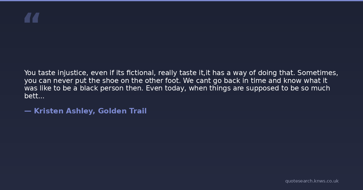 You taste injustice, even if its fictional, really taste it,it has a way of doing that. Sometimes, you can never put the shoe on the other foot. We cant go back in time and know what it was like to be a black person then. Even today, when things are supposed to be so much better, not one of you can understand what its like to be black, to live with the knowledge of what happened to your ancestry and still face injustice. But that book makes us taste it and, reading it, we know how bitter that taste is and we know we dont like it. But that bitter wakes you up, and when you wake up, you open your mind to things in this world, you make yourself think. Then youll decide you dont like the taste of injustice, not for you and not for anyone, and youll understand that even though all the battles cant be won, that doesnt mean you wont fight.