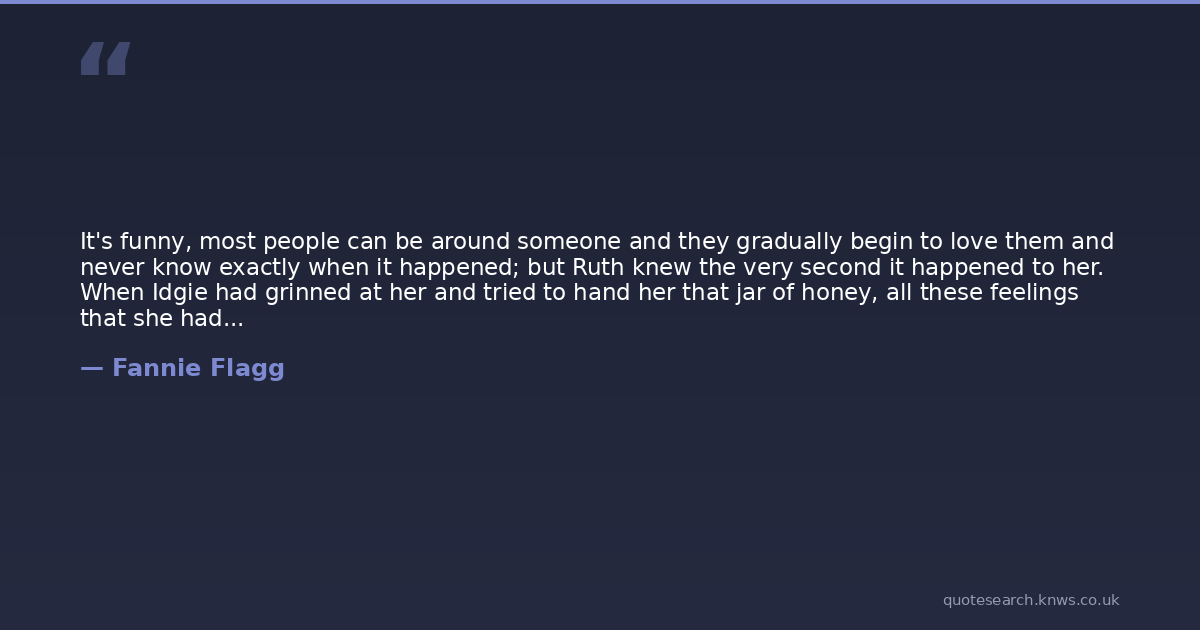 It's funny, most people can be around someone and they gradually begin to love them and never know exactly when it happened; but Ruth knew the very second it happened to her. When Idgie had grinned at her and tried to hand her that jar of honey, all these feelings that she had been trying to hold back came flooding through her, and it was at that second in time that she knew she loved Idgie with all her heart.