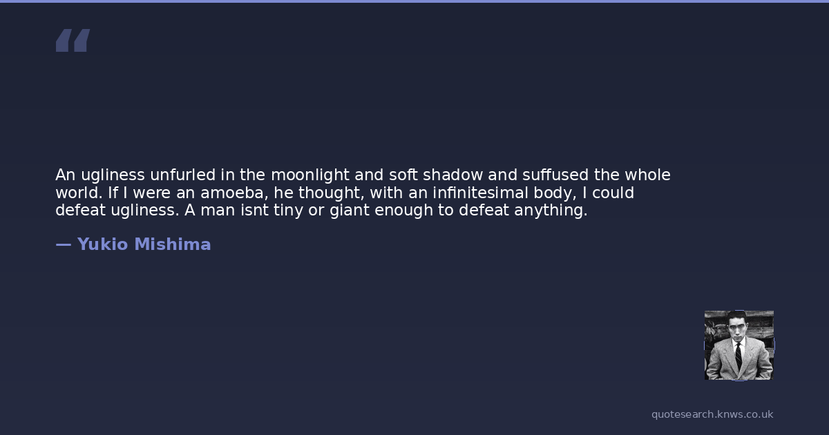 An ugliness unfurled in the moonlight and soft shadow and suffused the whole world. If I were an amoeba, he thought, with an infinitesimal body, I could defeat ugliness. A man isnt tiny or giant enough to defeat anything.