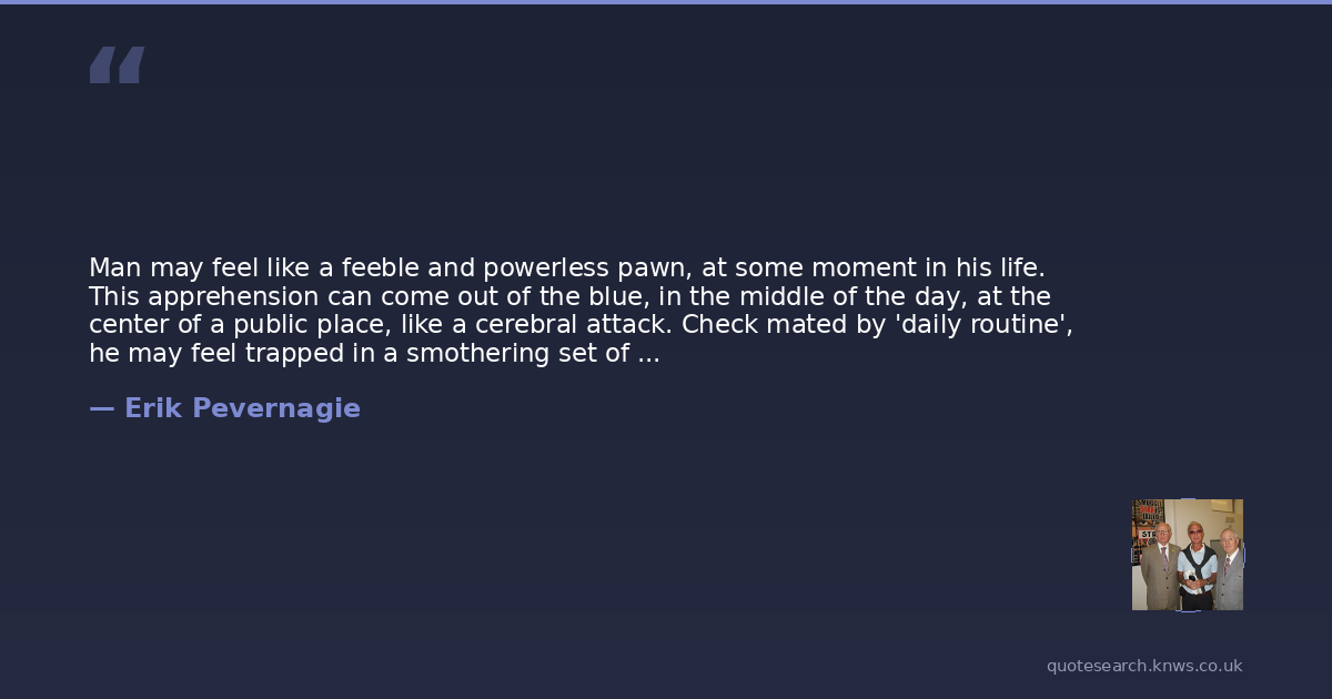 Man may feel like a feeble and powerless pawn, at some moment in his life. This apprehension can come out of the blue, in the middle of the day, at the center of a public place, like a cerebral attack. Check mated by 'daily routine', he may feel trapped in a smothering set of circumstances and only a deconstruction of all impeding barriers can bring about a vital mental deliverance. ( "Check and mate" )