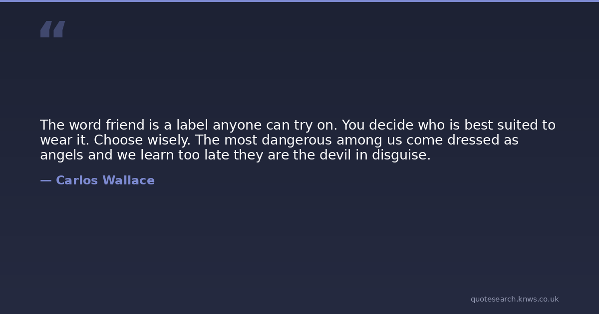 The word friend is a label anyone can try on. You decide who is best suited to wear it. Choose wisely. The most dangerous among us come dressed as angels and we learn too late they are the devil in disguise.