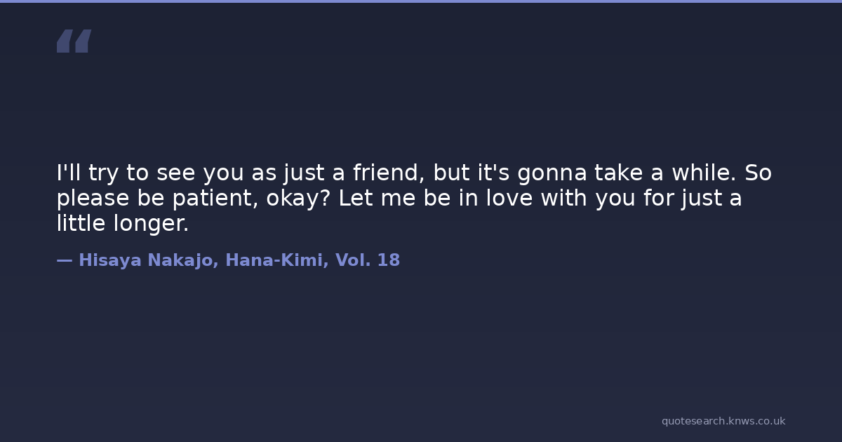 I'll try to see you as just a friend, but it's gonna take a while. So please be patient, okay? Let me be in love with you for just a little longer.