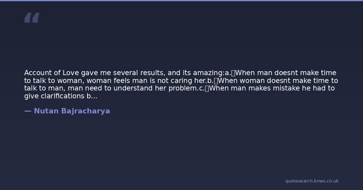 Account of Love gave me several results, and its amazing:a. When man doesnt make time to talk to woman, woman feels man is not caring her.b. When woman doesnt make time to talk to man, man need to understand her problem.c. When man makes mistake he had to give clarifications by speaking truth or even lying. d. When woman makes mistake mad had to accept all excuses given by woman.e. When man suffers, most of the time he had to accept whatever happens.f. When woman suffers, man had to make woman happy by doing anything possibleg. When love ends man need to hide all the tears as he feels he is strong.h. When love ends woman uses tears to blame the man for all the mistakes.