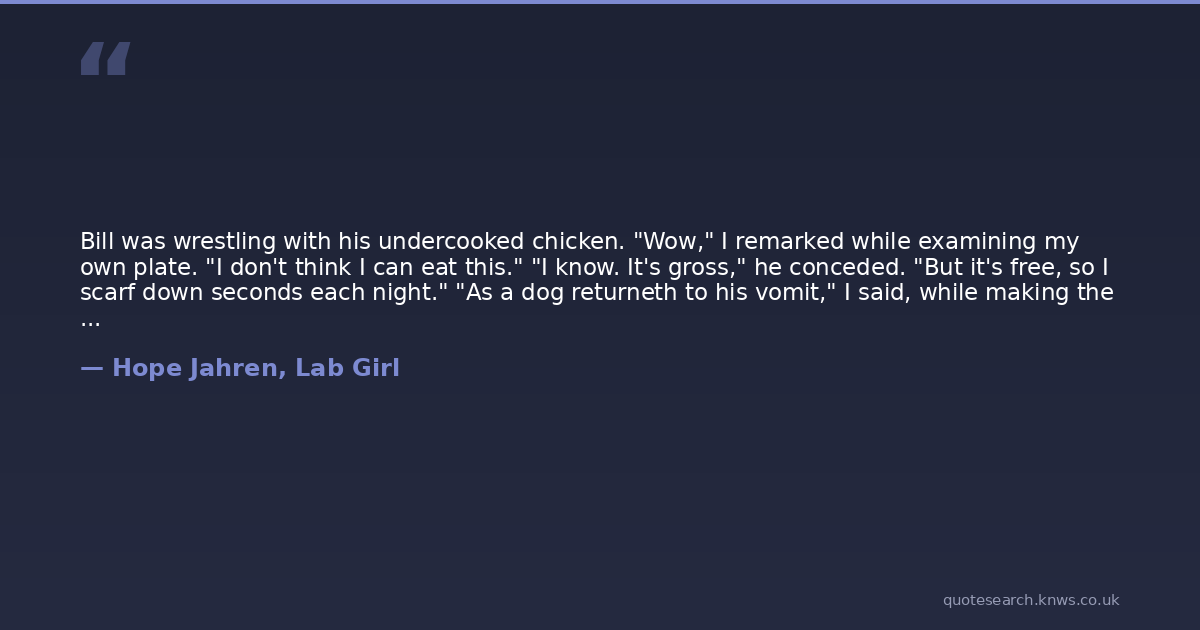 Bill was wrestling with his undercooked chicken. "Wow," I remarked while examining my own plate. "I don't think I can eat this." "I know. It's gross," he conceded. "But it's free, so I scarf down seconds each night." "As a dog returneth to his vomit," I said, while making the sign of the cross in the air in front of me. "Amen," he agreed with his mouth full, and toasted me with his 7Up can.