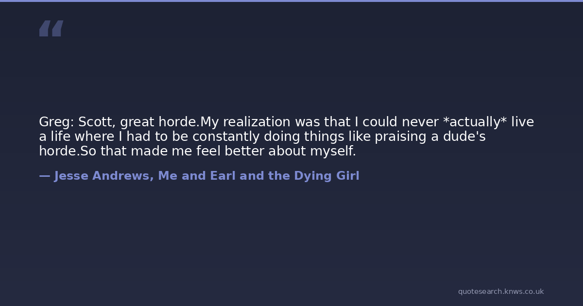 Greg: Scott, great horde.My realization was that I could never *actually* live a life where I had to be constantly doing things like praising a dude's horde.So that made me feel better about myself.