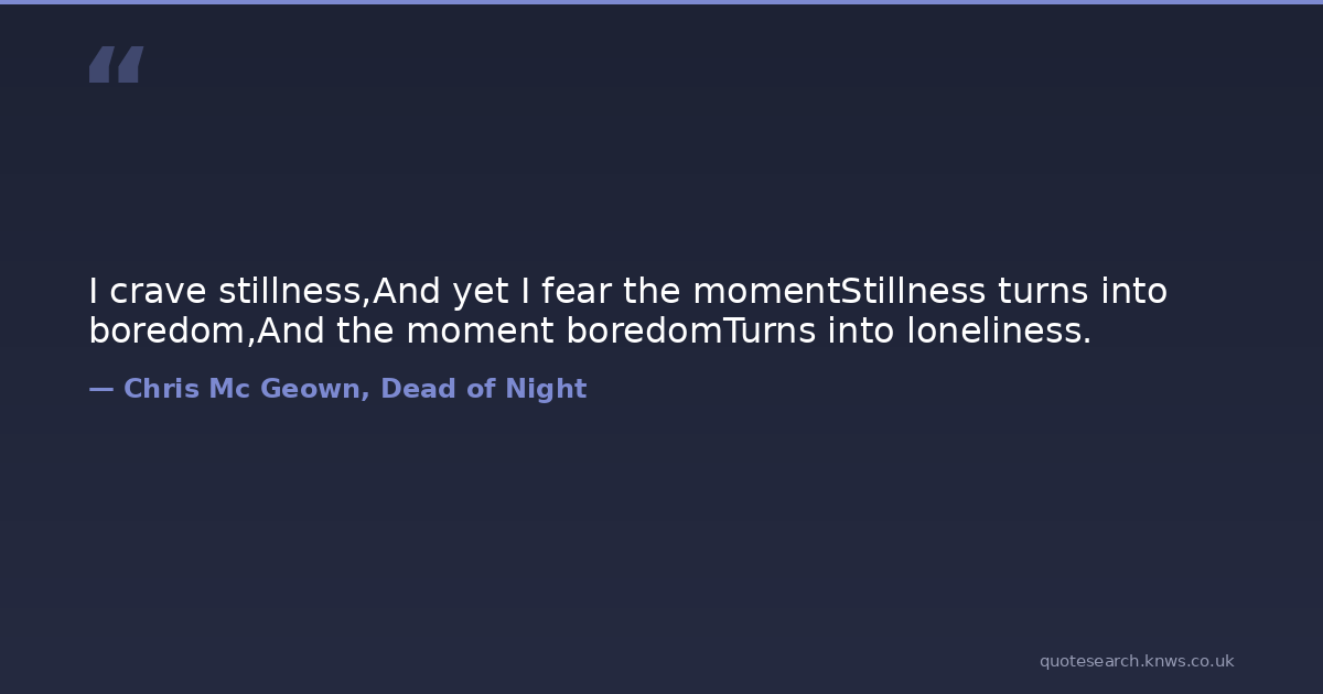 I crave stillness,And yet I fear the momentStillness turns into boredom,And the moment boredomTurns into loneliness. anxiety depression-quotes insomnia loneliness Download Image Share on X Share on Facebook Copy Link