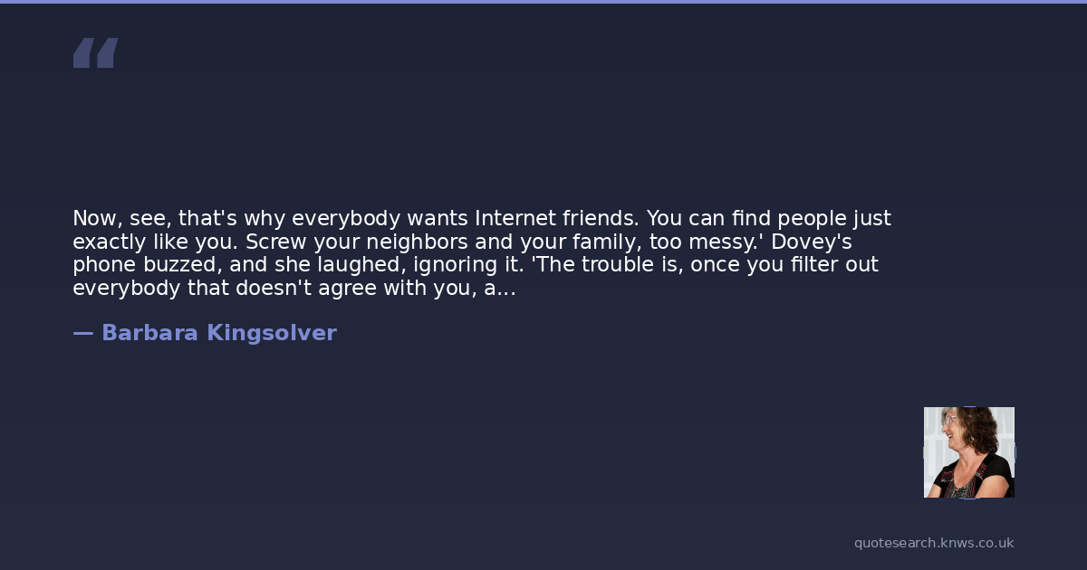 Now, see, that's why everybody wants Internet friends. You can find people just exactly like you. Screw your neighbors and your family, too messy.' Dovey's phone buzzed, and she laughed, ignoring it. 'The trouble is, once you filter out everybody that doesn't agree with you, all that's left is maybe this one retired surfer guy living in Idaho.