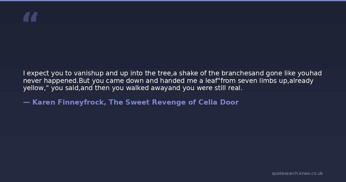 I expect you to vanishup and up into the tree,a shake of the branchesand gone like youhad never happened.But you came down and handed me a leaf"from seven limbs up,already yellow," you said,and then you walked awayand you were still real.