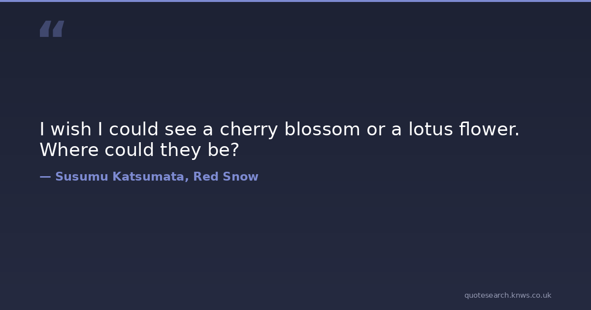 I wish I could see a cherry blossom or a lotus flower. Where could they be? cherry-blossom japan loneliness lotus-flower manga monk patience poetry rainy-season sakura specter susumu-katsumata temperance Download Image Share on X Share on Facebook Copy Link