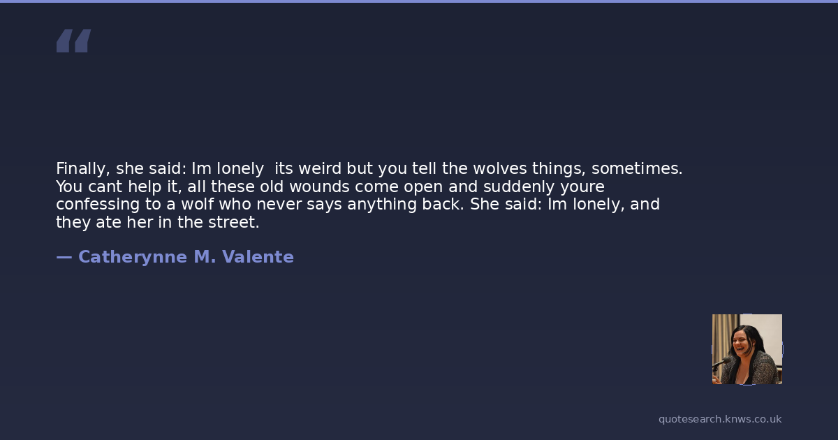 Finally, she said: Im lonely its weird but you tell the wolves things, sometimes. You cant help it, all these old wounds come open and suddenly youre confessing to a wolf who never says anything back. She said: Im lonely, and they ate her in the street.