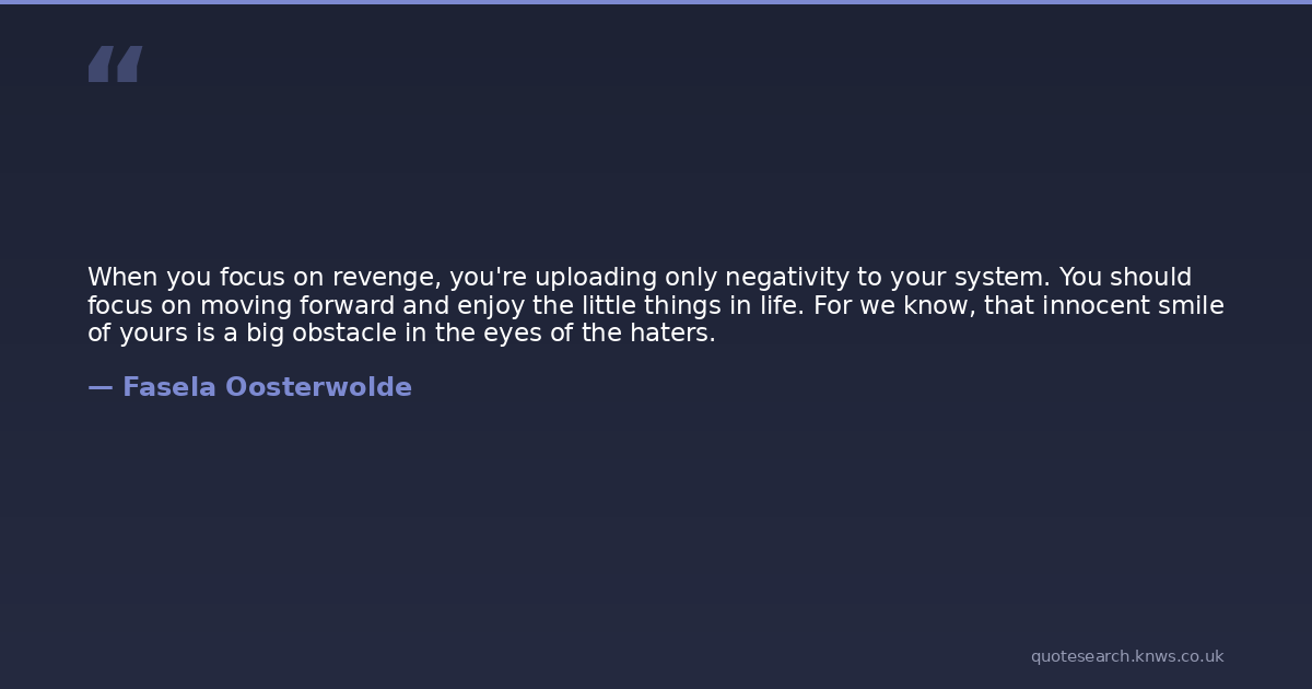 When you focus on revenge, you're uploading only negativity to your system. You should focus on moving forward and enjoy the little things in life. For we know, that innocent smile of yours is a big obstacle in the eyes of the haters.