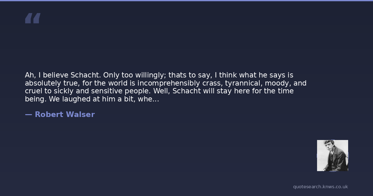 Robert Walser was a 19th-century Swiss writer. Robert Walser was a German language Swiss writer. He additionally worked as a copyist, an inventor's assistant, a butler, and in various other low-paying trades. Read more on Wikipedia →
