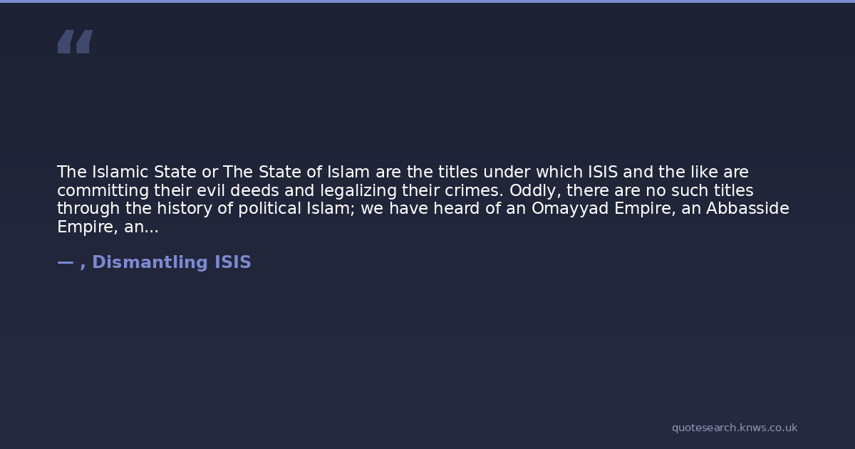 The Islamic State or The State of Islam are the titles under which ISIS and the like are committing their evil deeds and legalizing their crimes. Oddly, there are no such titles through the history of political Islam; we have heard of an Omayyad Empire, an Abbasside Empire, an Ottoman Empire, the Ayyubid State, and other states which made use of religion to expand their territories and control peoples minds and lives. These states held the names of the ruling dynasties but never Islam.