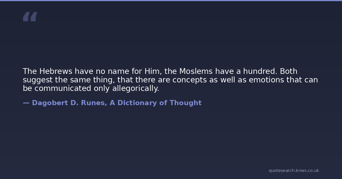 The Hebrews have no name for Him, the Moslems have a hundred. Both suggest the same thing, that there are concepts as well as emotions that can be communicated only allegorically.