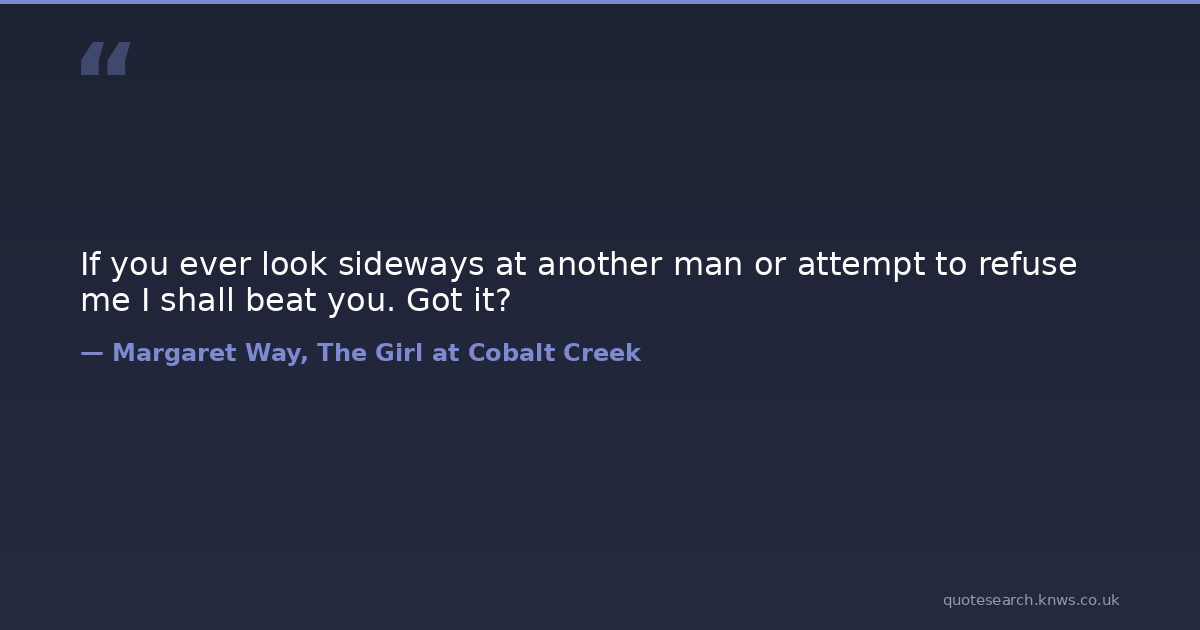 If you ever look sideways at another man or attempt to refuse me I shall beat you. Got it? beat beating flirt jealousy man refuse Download Image Share on X Share on Facebook Copy Link
