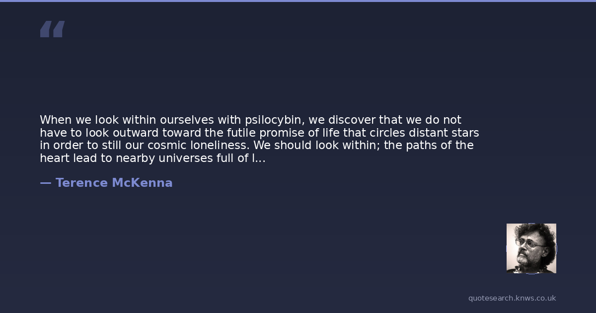 When we look within ourselves with psilocybin, we discover that we do not have to look outward toward the futile promise of life that circles distant stars in order to still our cosmic loneliness. We should look within; the paths of the heart lead to nearby universes full of life and affection for humanity.