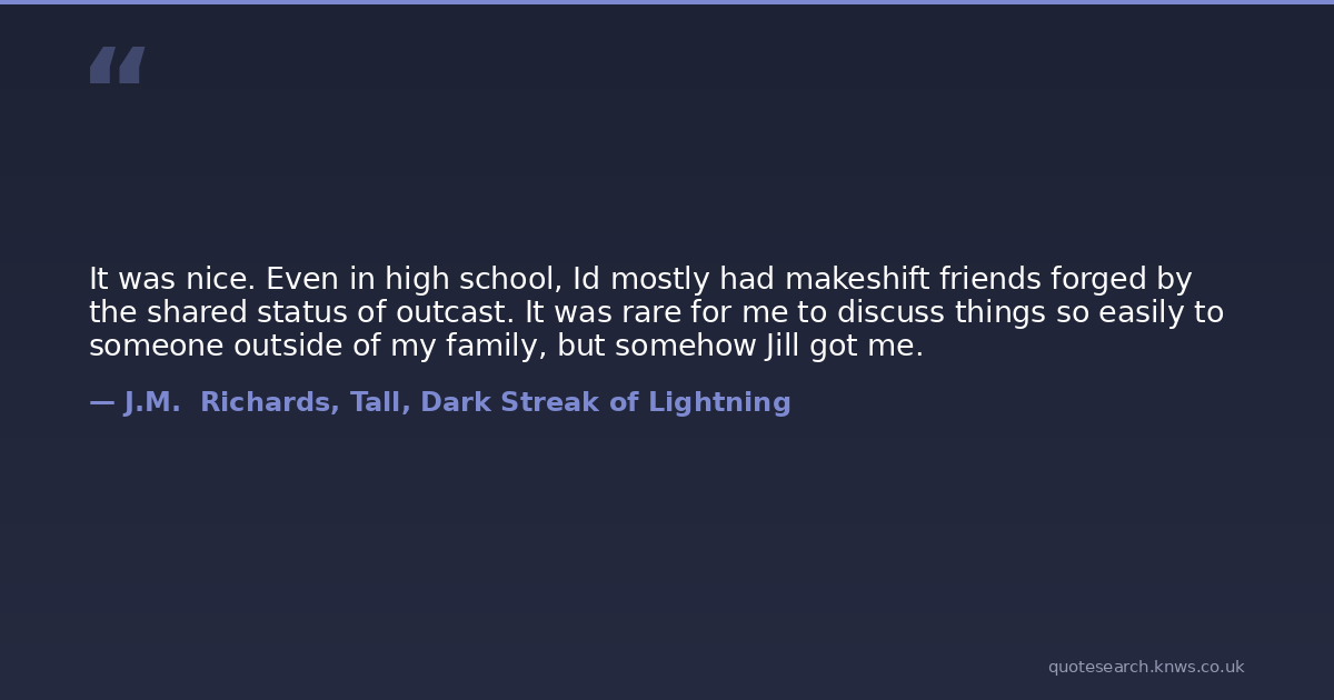 It was nice. Even in high school, Id mostly had makeshift friends forged by the shared status of outcast. It was rare for me to discuss things so easily to someone outside of my family, but somehow Jill got me.