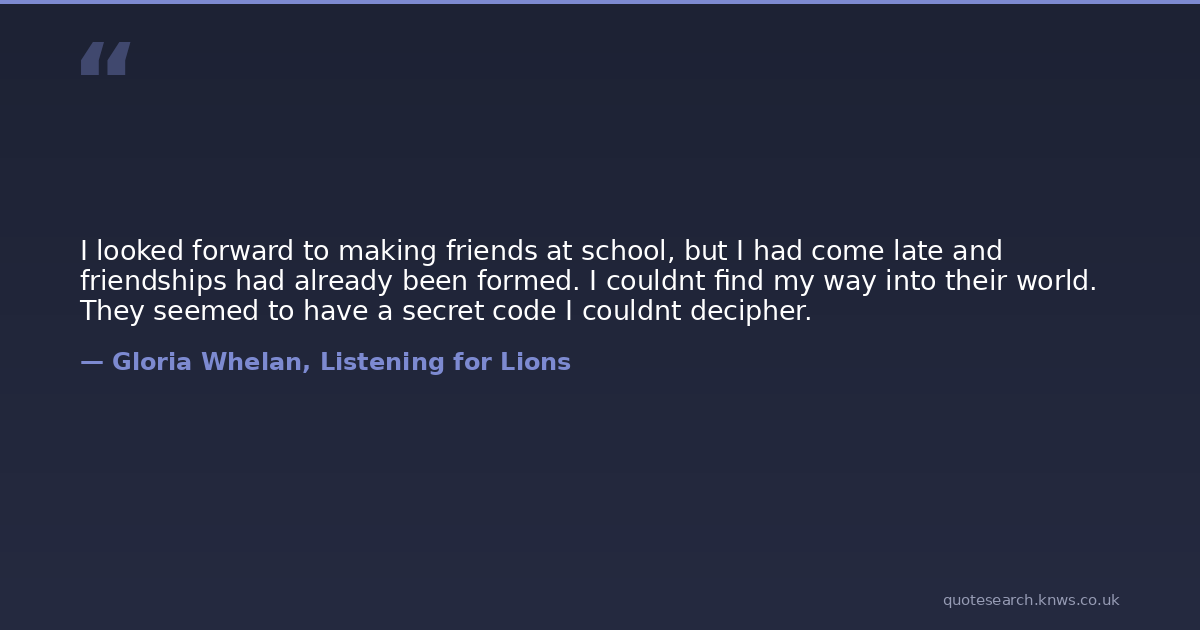 I looked forward to making friends at school, but I had come late and friendships had already been formed. I couldnt find my way into their world. They seemed to have a secret code I couldnt decipher.
