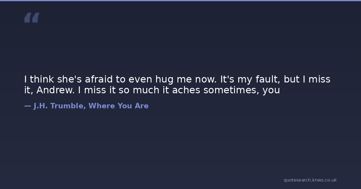 I think she's afraid to even hug me now. It's my fault, but I miss it, Andrew. I miss it so much it aches sometimes, you actions-speak-louder-than-words loneliness sensory-deprivation touch-me undesirable word-of-your-body Download Image Share on X Share on Facebook Copy Link