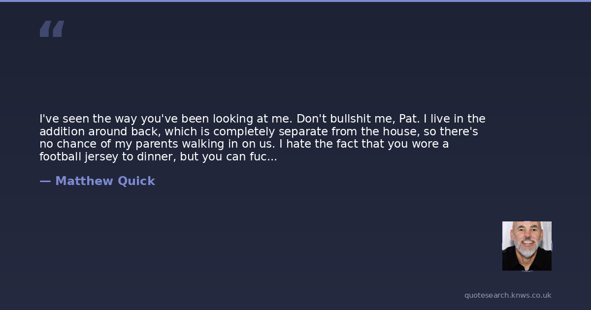 I've seen the way you've been looking at me. Don't bullshit me, Pat. I live in the addition around back, which is completely separate from the house, so there's no chance of my parents walking in on us. I hate the fact that you wore a football jersey to dinner, but you can fuck me as long as we turn the lights out first. Okay?