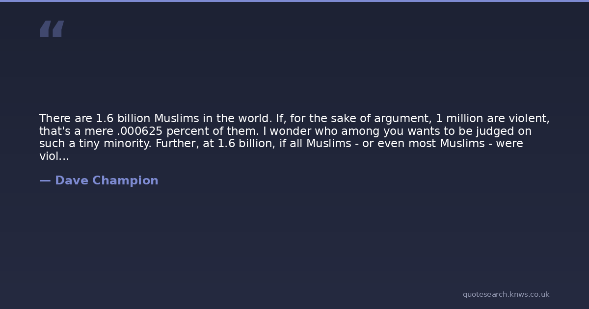 There are 1.6 billion Muslims in the world. If, for the sake of argument, 1 million are violent, that's a mere .000625 percent of them. I wonder who among you wants to be judged on such a tiny minority. Further, at 1.6 billion, if all Muslims - or even most Muslims - were violent, the world would already be in flames. Most people simply want to live their lives in peace, with some degree of material comfort. I find it bizarre - and disturbing - that so many Americans imagine that being a Muslim somehow trumps human nature and makes ordinary simple people want to rise up and kill everyone. That takes a special kind of stupid.