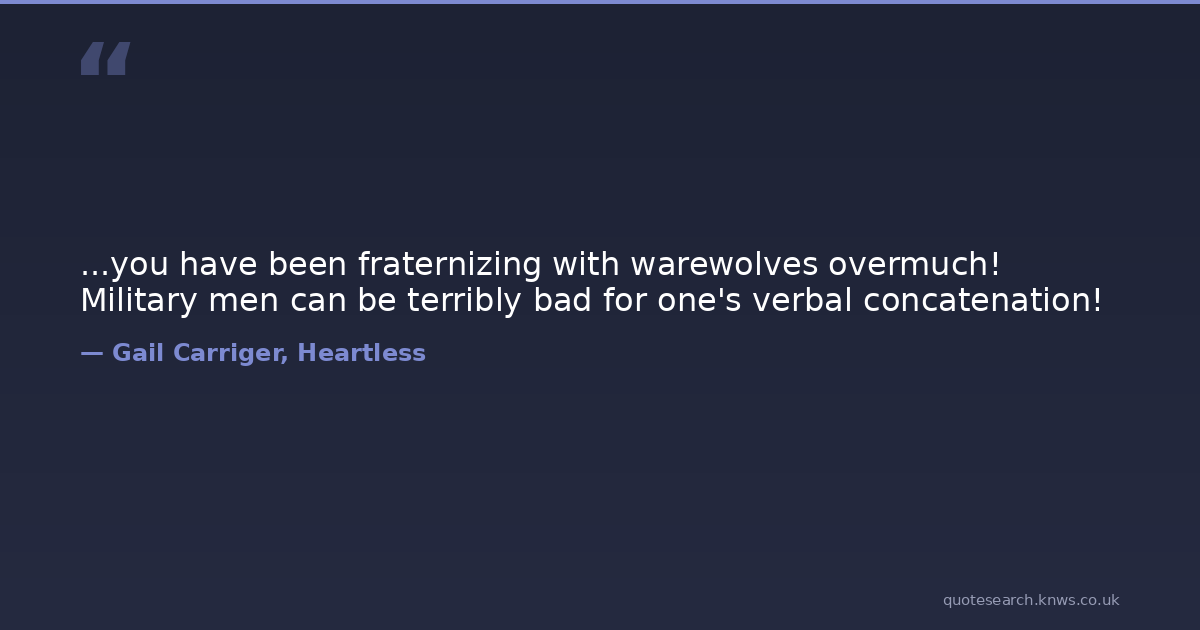 ...you have been fraternizing with warewolves overmuch! Military men can be terribly bad for one's verbal concatenation! men military speech warewolves Download Image Share on X Share on Facebook Copy Link
