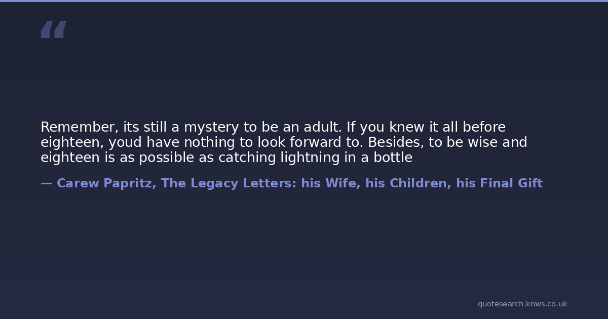 Remember, its still a mystery to be an adult. If you knew it all before eighteen, youd have nothing to look forward to. Besides, to be wise and eighteen is as possible as catching lightning in a bottle