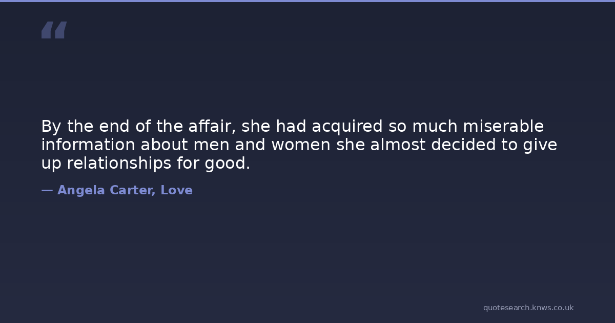 By the end of the affair, she had acquired so much miserable information about men and women she almost decided to give up relationships for good.