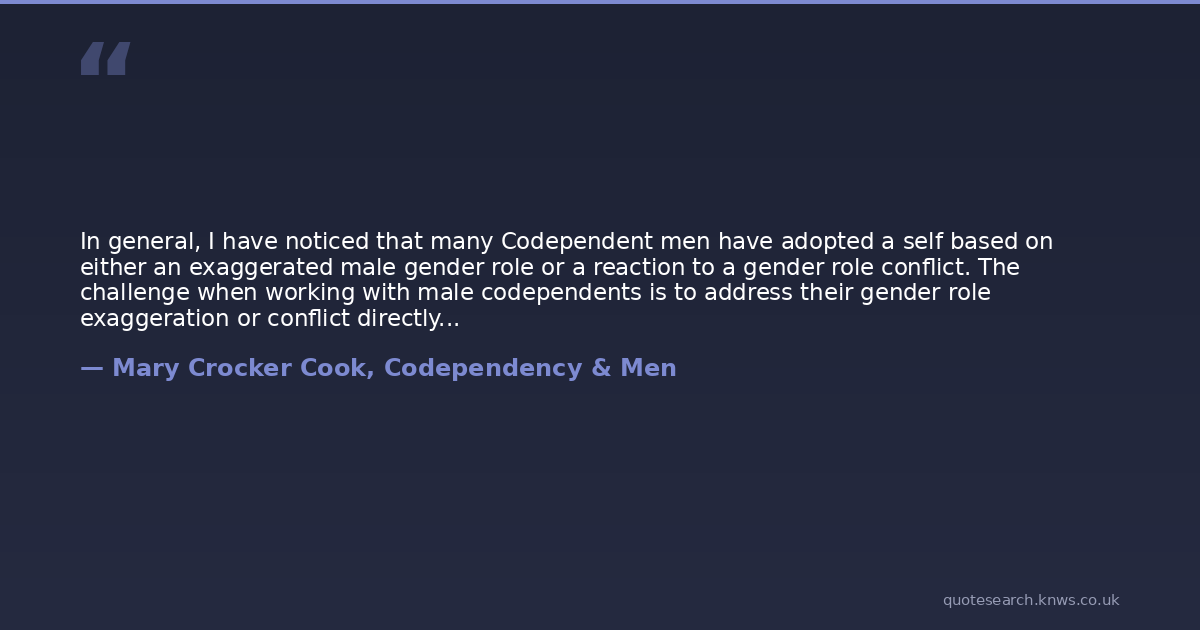 In general, I have noticed that many Codependent men have adopted a self based on either an exaggerated male gender role or a reaction to a gender role conflict. The challenge when working with male codependents is to address their gender role exaggeration or conflict directly to see how this gender role self has been created as a result of early attachment disruption.