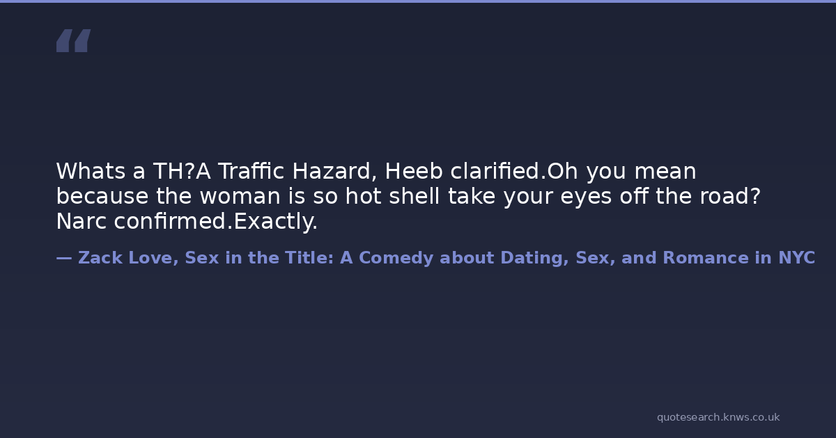 Whats a TH?A Traffic Hazard, Heeb clarified.Oh you mean because the woman is so hot shell take your eyes off the road? Narc confirmed.Exactly.