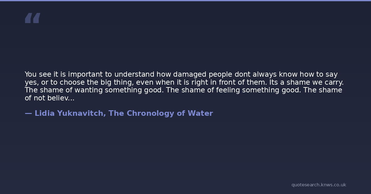 You see it is important to understand how damaged people dont always know how to say yes, or to choose the big thing, even when it is right in front of them. Its a shame we carry. The shame of wanting something good. The shame of feeling something good. The shame of not believing we deserve to stand in the same room in the same way as all those we admire. Big red As on our chests. I never thought to myself growing up, be a lawyer. An astronaut. The President. A scientist. A doctor. An architect. I didnt even think, be a writer. Aspiration gets stuck in some people. Its difficult to think yes. Or up. When all you feel is fight or run.