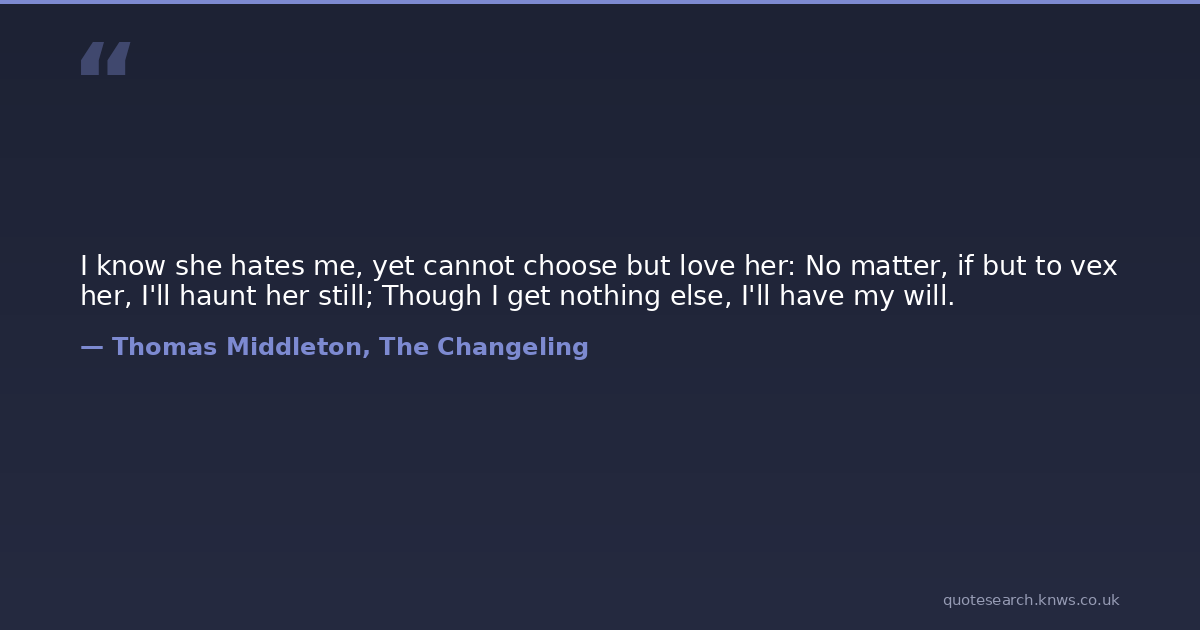 I know she hates me, yet cannot choose but love her: No matter, if but to vex her, I'll haunt her still; Though I get nothing else, I'll have my will.