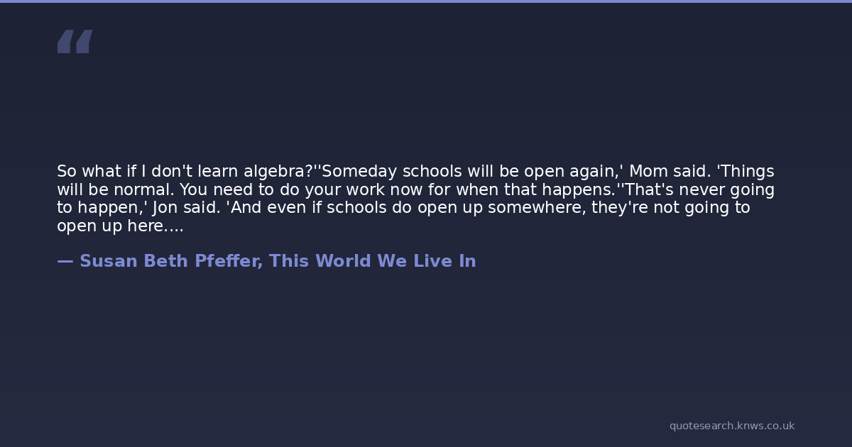 So what if I don't learn algebra?''Someday schools will be open again,' Mom said. 'Things will be normal. You need to do your work now for when that happens.''That's never going to happen,' Jon said. 'And even if schools do open up somewhere, they're not going to open up here. There aren't enough people left.' 'We don't know how many people are like us, holed up, making do until times get better.''I bet whoever they are, they aren't studying algebra,' Jon said.