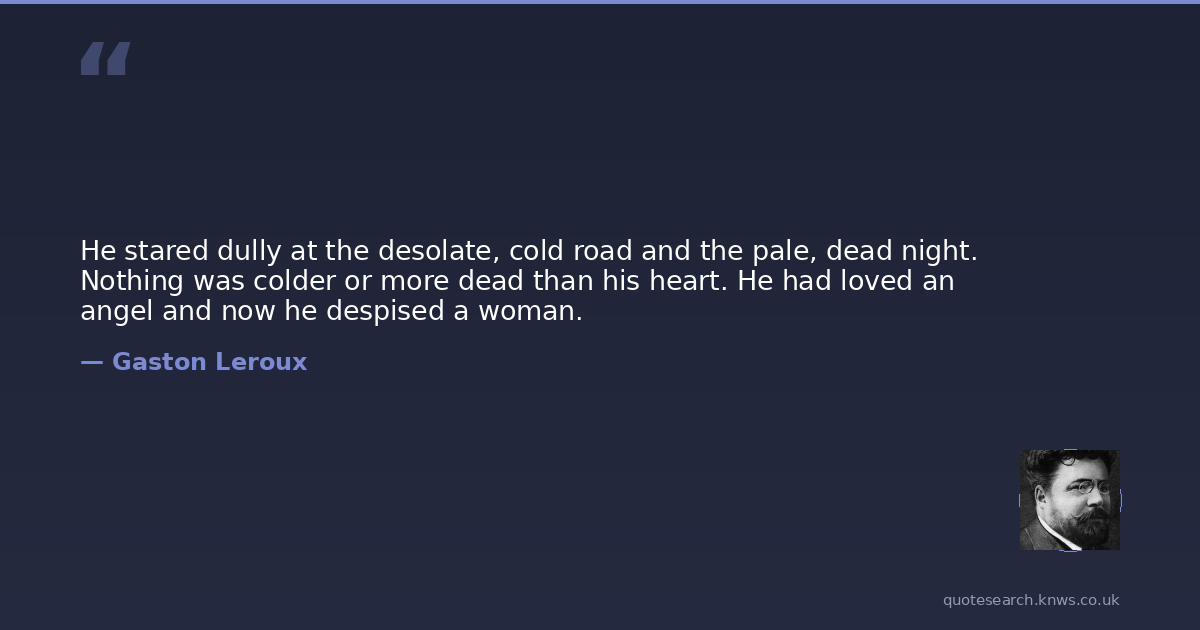 He stared dully at the desolate, cold road and the pale, dead night. Nothing was colder or more dead than his heart. He had loved an angel and now he despised a woman.