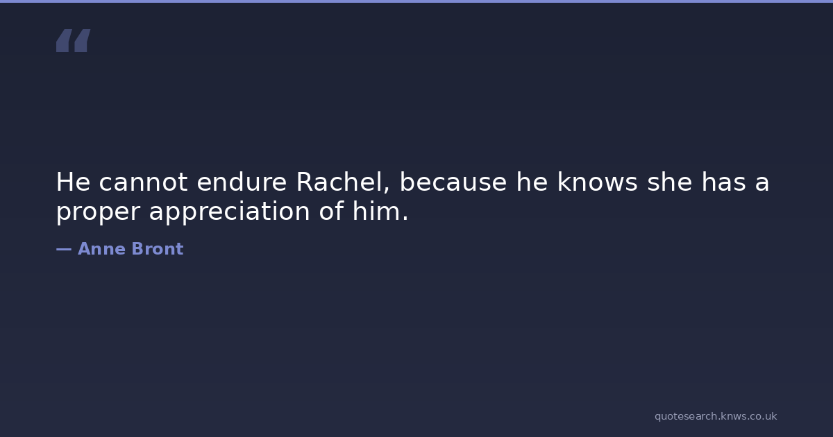 He cannot endure Rachel, because he knows she has a proper appreciation of him. appreciation hate Download Image Share on X Share on Facebook Copy Link