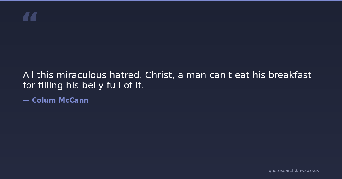 All this miraculous hatred. Christ, a man can't eat his breakfast for filling his belly full of it.