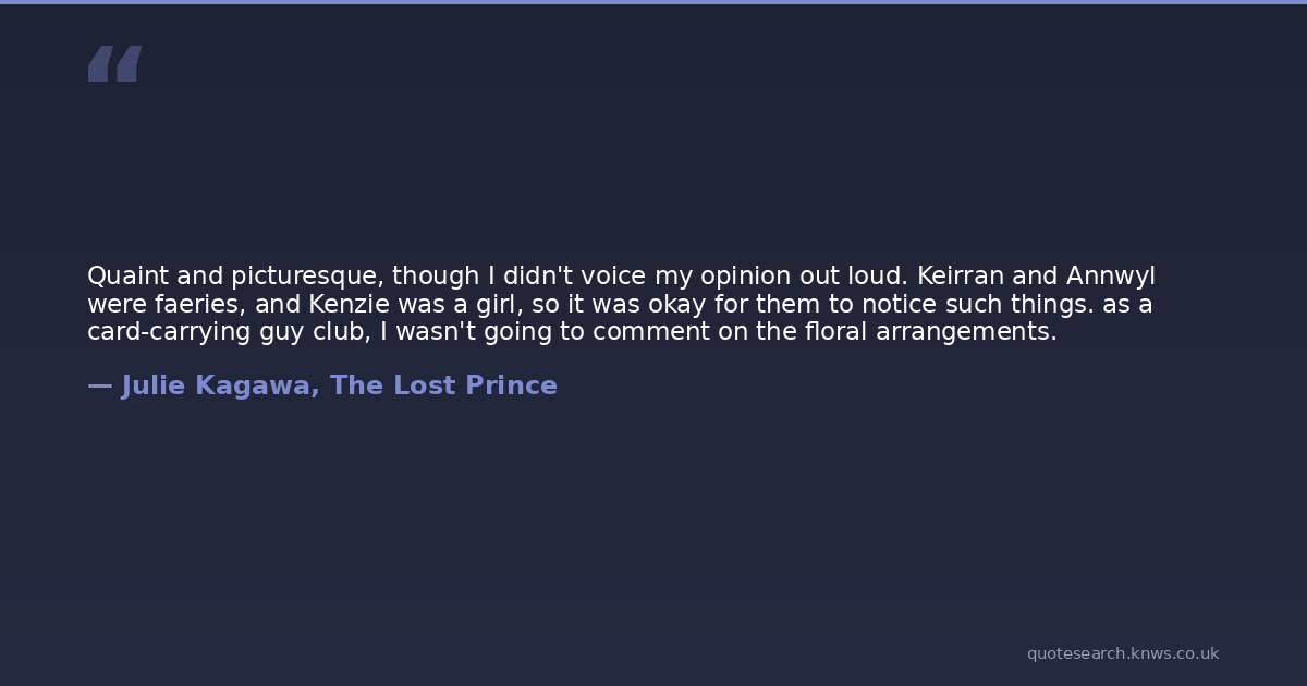 Quaint and picturesque, though I didn't voice my opinion out loud. Keirran and Annwyl were faeries, and Kenzie was a girl, so it was okay for them to notice such things. as a card-carrying guy club, I wasn't going to comment on the floral arrangements.
