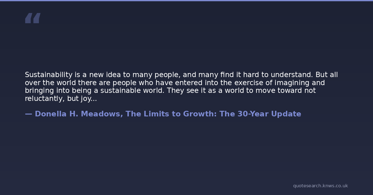 Sustainability is a new idea to many people, and many find it hard to understand. But all over the world there are people who have entered into the exercise of imagining and bringing into being a sustainable world. They see it as a world to move toward not reluctantly, but joyfully, not with a sense of sacrifice, but a sense of adventure. A sustainable world could be very much better than the one we live in today.