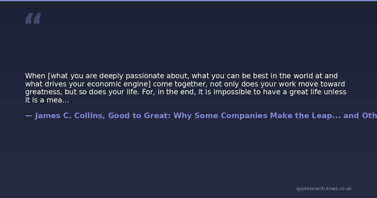 When [what you are deeply passionate about, what you can be best in the world at and what drives your economic engine] come together, not only does your work move toward greatness, but so does your life. For, in the end, it is impossible to have a great life unless it is a meaningful life. And it is very difficult to have a meaningful life without meaningful work. Perhaps, then, you might gain that rare tranquility that comes from knowing that youve had a hand in creating something of intrinsic excellence that makes a contribution. Indeed, you might even gain that deepest of all satisfactions: knowing that your short time here on this earth has been well spent, and that it mattered.