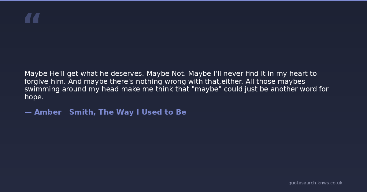 Maybe He'll get what he deserves. Maybe Not. Maybe I'll never find it in my heart to forgive him. And maybe there's nothing wrong with that,either. All those maybes swimming around my head make me think that "maybe" could just be another word for hope.