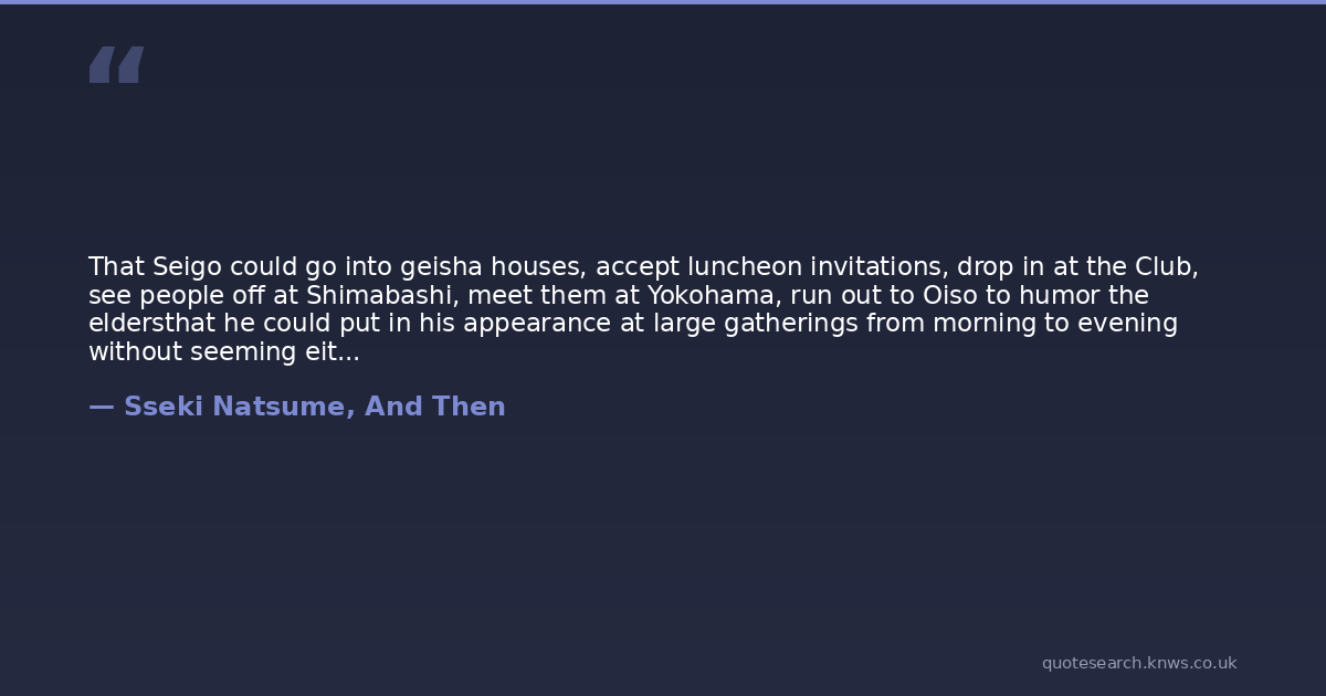 That Seigo could go into geisha houses, accept luncheon invitations, drop in at the Club, see people off at Shimabashi, meet them at Yokohama, run out to Oiso to humor the eldersthat he could put in his appearance at large gatherings from morning to evening without seeming either triumphant or dejectedthis must be because he was thoroughly accustomed to this kind of life, thought Daisuke; it was probably like the jellyfish's floating in the sea and not finding it salty.