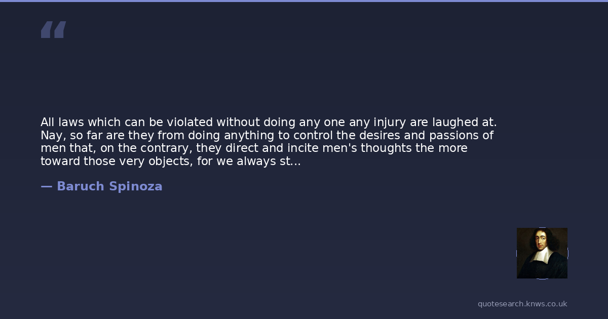 All laws which can be violated without doing any one any injury are laughed at. Nay, so far are they from doing anything to control the desires and passions of men that, on the contrary, they direct and incite men's thoughts the more toward those very objects, for we always strive toward what is forbidden and desire the things we are not allowed to have. And men of leisure are never deficient in the ingenuity needed to enable them to outwit laws framed to regulate things which cannot be entirely forbidden... He who tries to determine everything by law will foment crime rather than lessen it.