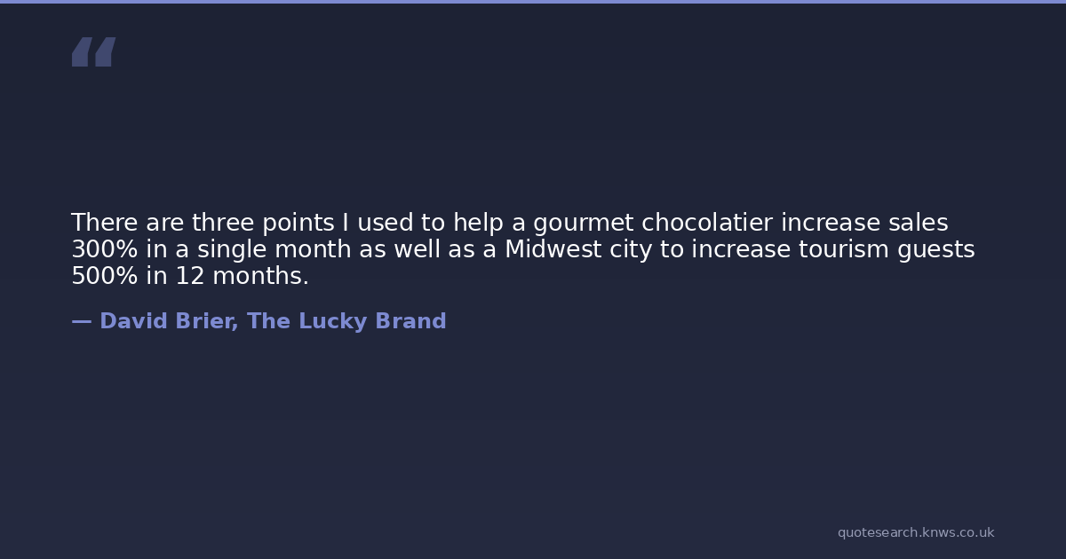 There are three points I used to help a gourmet chocolatier increase sales 300% in a single month as well as a Midwest city to increase tourism guests 500% in 12 months.