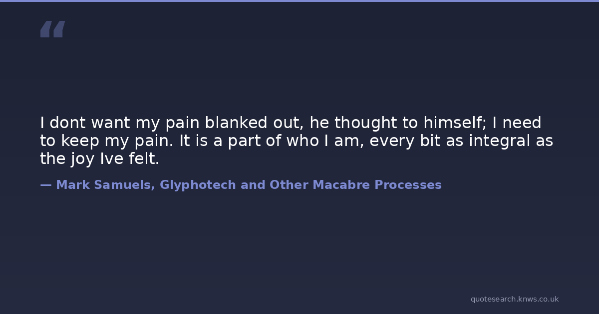 I dont want my pain blanked out, he thought to himself; I need to keep my pain. It is a part of who I am, every bit as integral as the joy Ive felt.