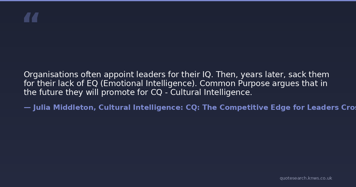 Organisations often appoint leaders for their IQ. Then, years later, sack them for their lack of EQ (Emotional Intelligence). Common Purpose argues that in the future they will promote for CQ - Cultural Intelligence.